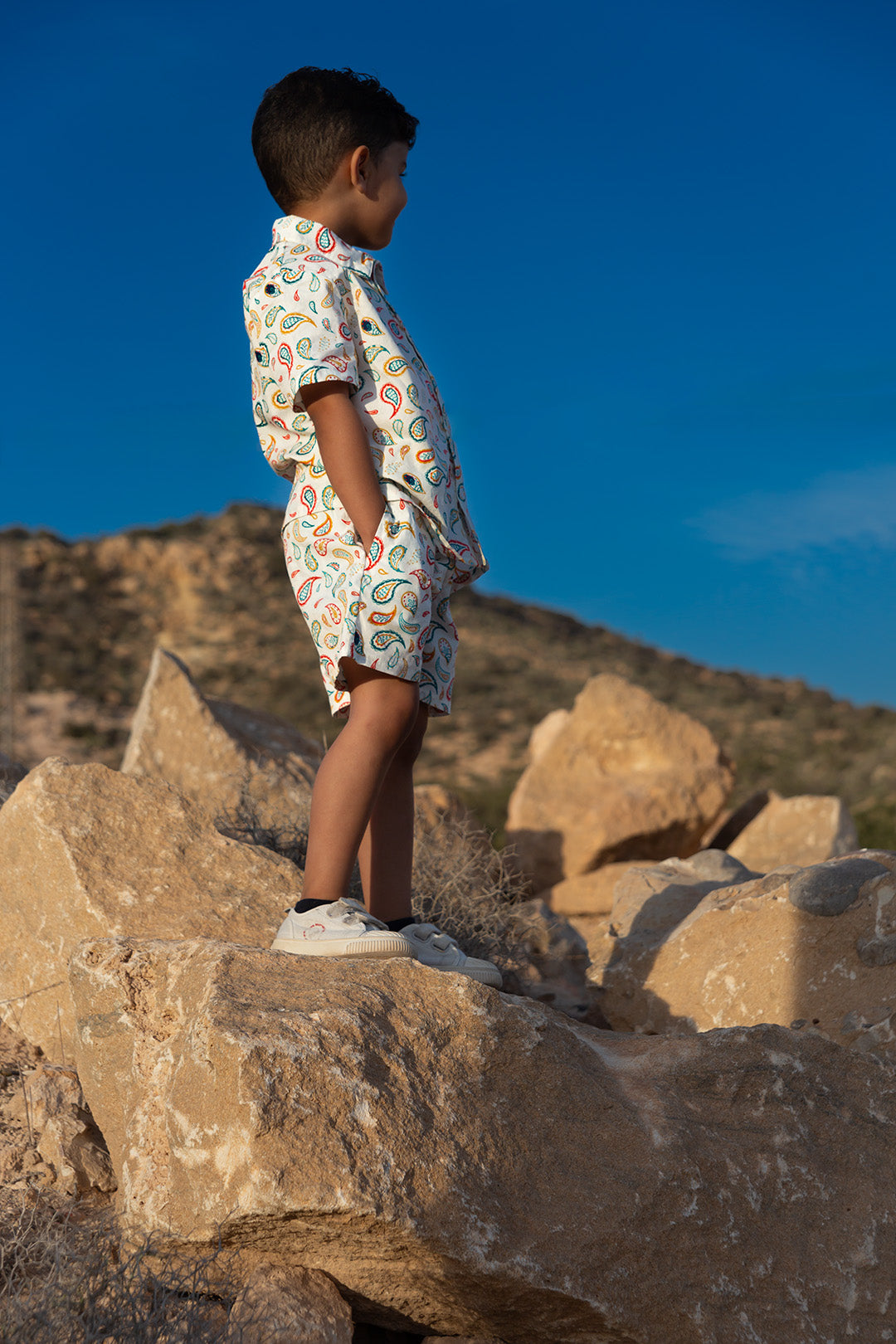 Deze zomerse set straalt vrolijke elegantie uit dankzij de verfijnde paisleyprint en luchtige pasvorm – een perfecte balans tussen comfort en stijl.