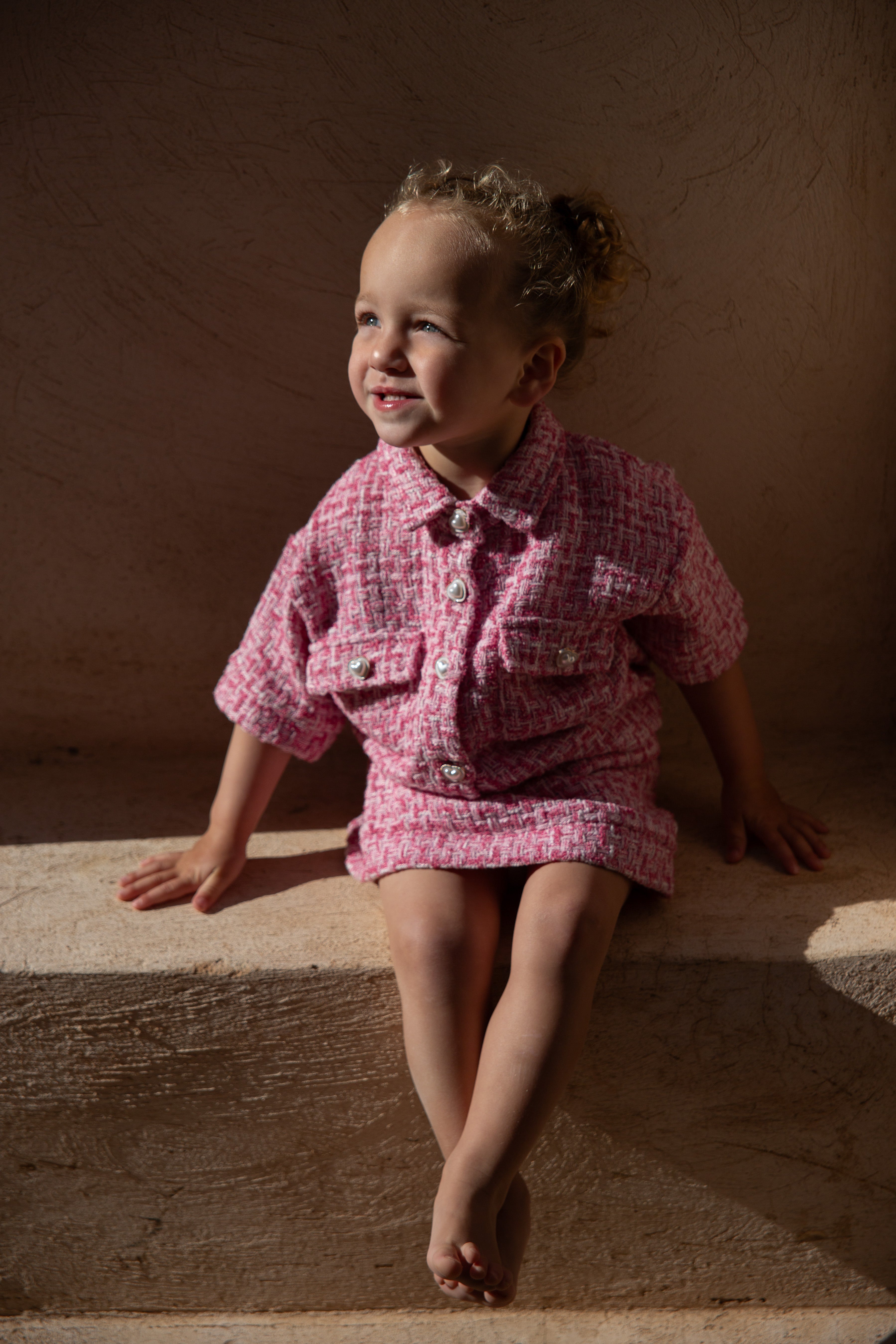 De rijke tweedstof en de glanzende hartvormige knopen brengen een subtiele knipoog naar haute couture, terwijl de zachte structuur zorgt voor ultiem draagcomfort.